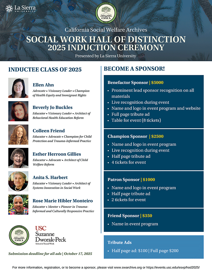 This event is hosted by the USC Suzanne Dworak-Peck School of Social Work. Please contact cswa@swarchive.org for more information.